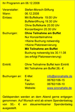 mit dabei sind. Die Vorbestellung bid zum 30.11.08 ist zwingend notwendig entweder über www.sironahalle.de oder Telefon 06782/106-10 oder Fax 06782/106-15. Die Menükarte finden sie hier.